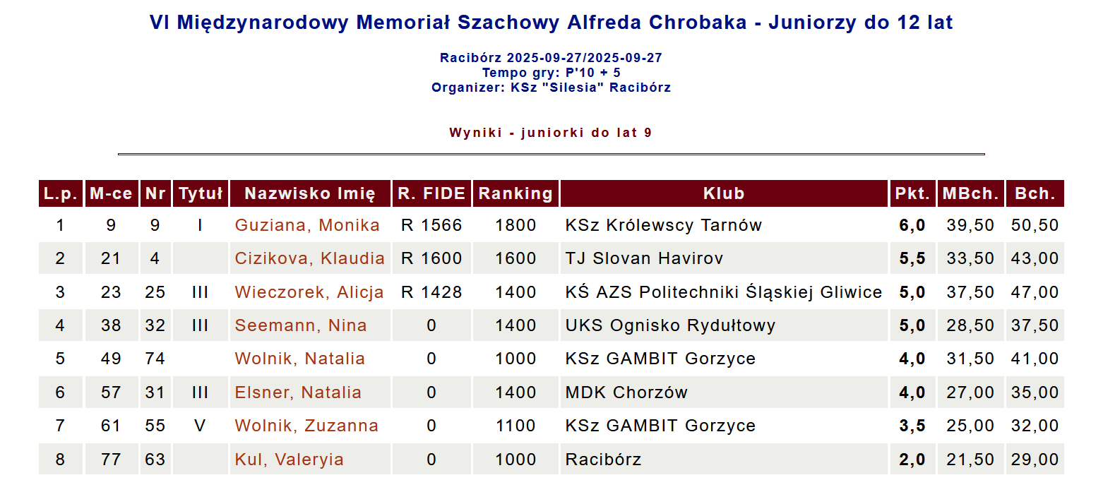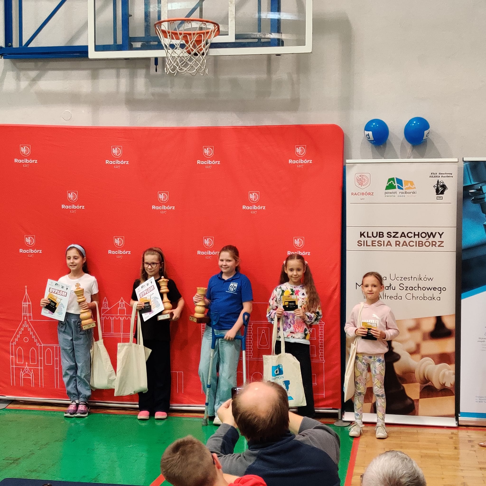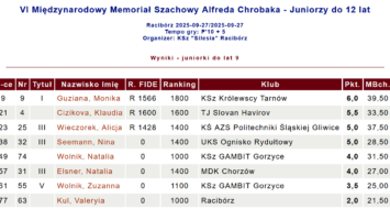 W sobotę 27 września w Raciborzu odbył się VI Międzynarodowy Memoriał Szachowy im. Alfreda Chrobaka. Do rywalizacji w dużym openie przystąpiło aż 79 młodych szachistów. Nasze oczy zwrócone były jednak w kierunku klasyfikacji juniorek do lat 9. Ze sporymi sukcesami indywidualnymi dzielnie walczyły nasze dziewczynki: Natalia i Zuzanna Wolnik. Odpowiednio 5 i 7 miejsce to bardzo przyzwoite rezultaty, biorąc pod uwagę obsadę turnieju.